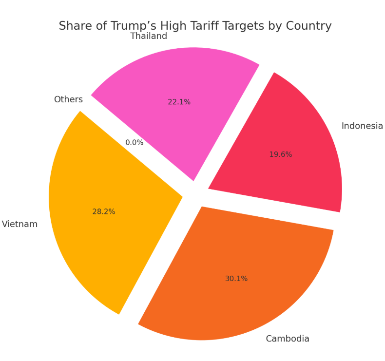 트럼프가 발표한 새로운 관세율은 베트남산 46%, 캄보디아산 49%, 인도네시아산 32%, 그리고 **태국산 36%**에 달한다. 이는 기존 중국산 대비도 높은 수치다.
